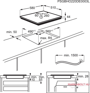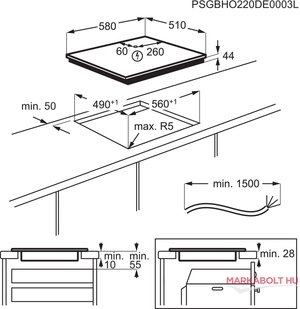 - bal hátsó: indukciós 2300/3200 W / 210 mm - jobb hátsó: indukciós, 1800/2800 W / 180 mm - bal első: indukciós 2300/3200 W / 210 mm - jobb első: indukciós, 1400/2500 W / 145 mm |