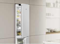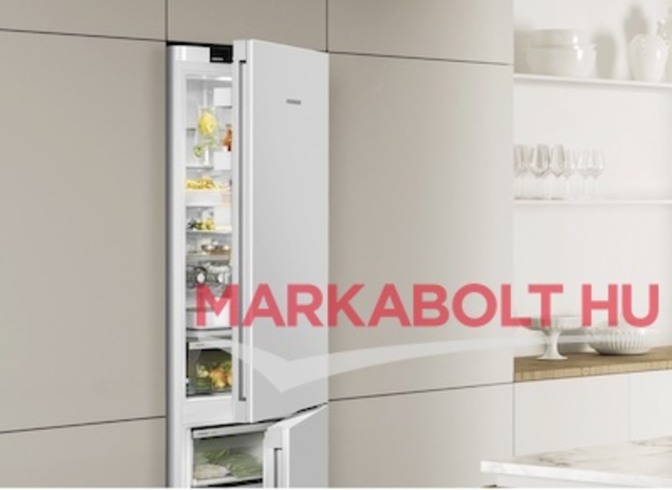 Liebherr KGN 52Vd03 kombinált hűtőgép ajtaja egyszerű, klasszikus, minőségi: fényesre fehérre lakkozott felületével különösen jól illik a letisztult környezetbe. A fehér felület masszív és könnyen tisztítható. A készülék ún. InteriorFit kialakítású, ami azt jelenti, hogy pontosan kitölti a 60 cm mélységű szabad helyet. Csak az ajtó emelkedik ki határozottan és biztosítja a hozzáférést a süllyesztett fogantyúhoz. A függőlegesen végigfutó, ergonomikus süllyesztett fogantyúnak köszönhetően a készülék kényelmesen és könnyedén nyitható.