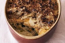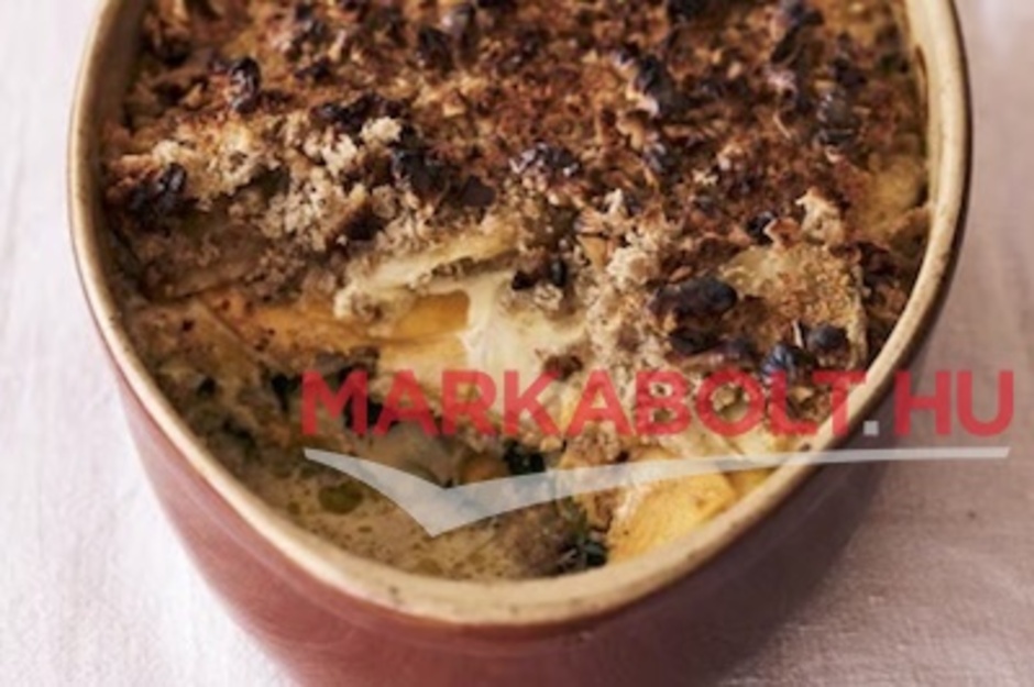 Ez a tartalmas, őszi–téli fogás lehet köret vagy önálló főétel. A rétegezett zöldségek, a fűszeres tejszín és a diós morzsa egymást kiegészítve adják a gazdag ízét, miközben a tetején kialakul a jellegzetes, aranybarna „au gratin” kéreg.